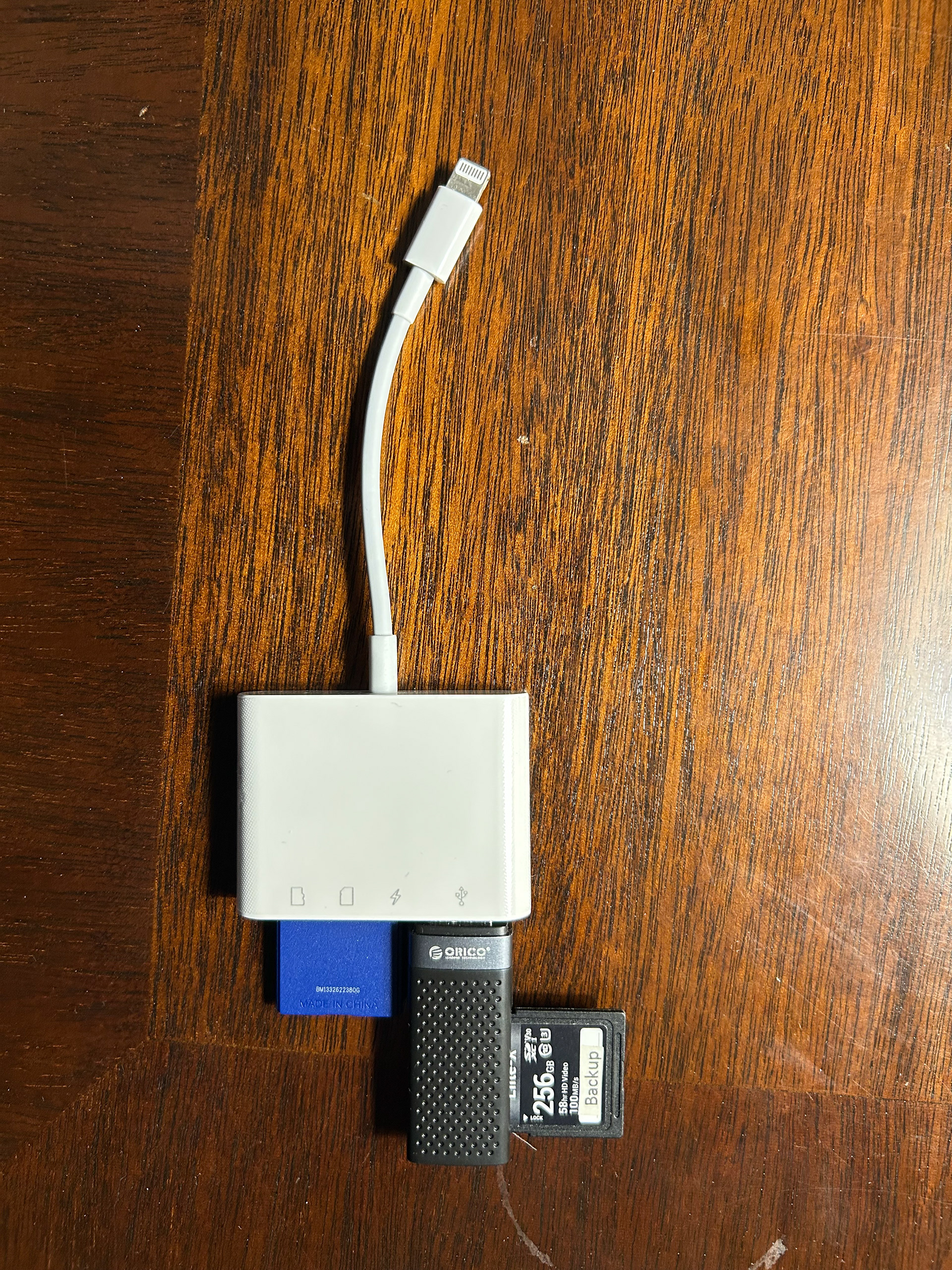 On every trip, I bring my iPad to read books, watch movies, or browse travel websites. It could be an Android tablet, but I’m fully ensconced in the Apple ecosystem. With the right dongle files can be transferred from the camera’s SD card to a USB drive. In iPad OS, open the Files app, attach the dongle with the SD card and USB drive inserted, and voila! Files can be copied between the two without taking up memory on the iPad. I do this every evening before bed, hopefully with a glass of wine in hand. Remember to store the backup USB drive in a different suitcase from your camera equipment.
